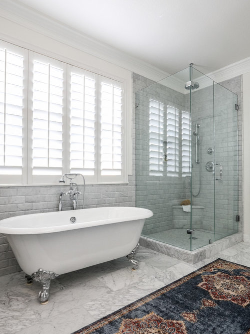 This bath features 3cm Bianco Carrera Marble at the vanities, Restoration Hardware, Ann Sacks "Savoy" 3X6 and 2x4 tile in Dove on shower walls and backsplash, D190 Payette Liner for shower walls and niche, 3" Carrara Hex honed and polished floor and shower floor tile, Benjamin Moore "River Reflections" ...