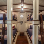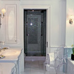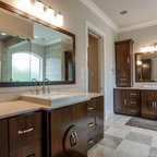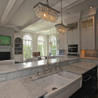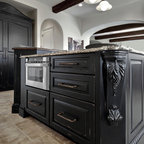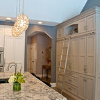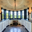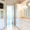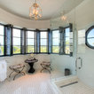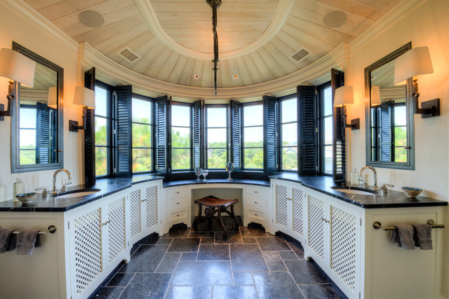 Curved Master Bedroom with Black Marble Counters, Black Shutters, and White Wood Lattice Cabinets