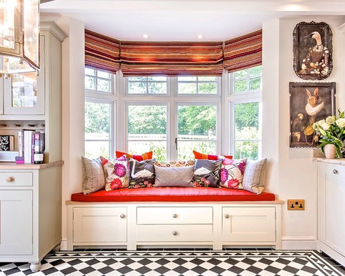 The Ben Heath bespoke window seat has been painted in a colour to compliment the blinds and to distinguish it from the kitchen cabinets although the design is the same. The dresser to the left has an oak oiled top with oak door fittings to provide extra storage space - maximising the use of walls in the small kitchen/diner.
