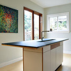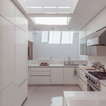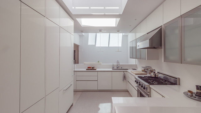 Bright white and bright skylights and high gloss cabinets, glass and stainless steel create a brilliant kitchen.