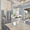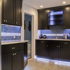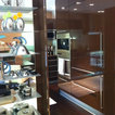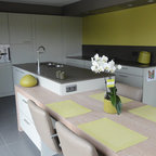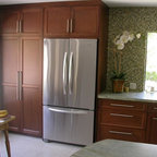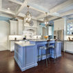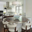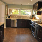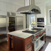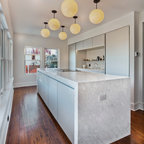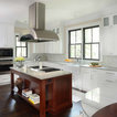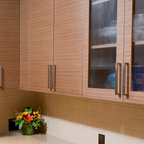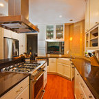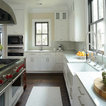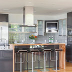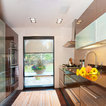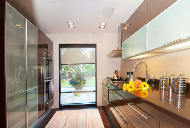 In a small space, you need to use every inch of space. The clean lines, reflective surfaces, and muted color palate create a beautiful unified-looking kitchen that boasts significant storage space and working counter space.