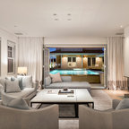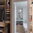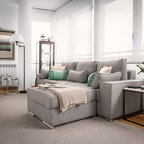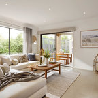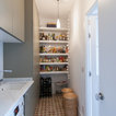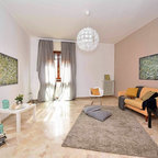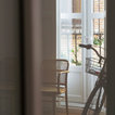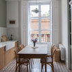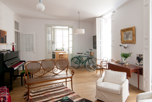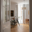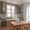 Cocina y salón conectados por una puerta doble corredera con cuarterones de cristal comprada en Otranto (BCN)