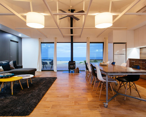 Dining room with wood burning stove, floor to ceiling sliding doors to deck. Concrete walls with picture hanging system. Photo:Chad Holder