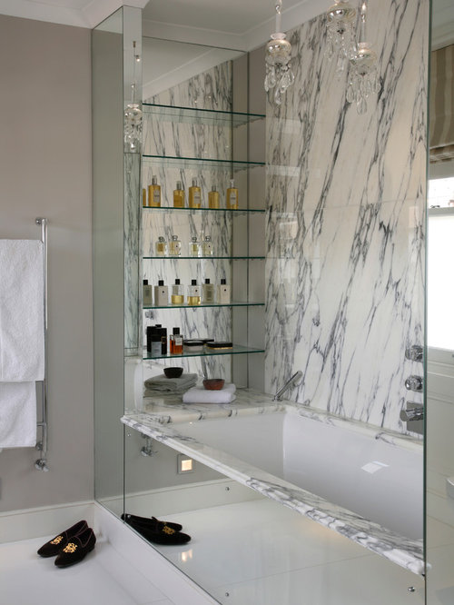 Tip: For a seamless, uncluttered look that lets the feature tiles shine, use glass shelves, as VSP Interiors has done in this bathroom. It gives you extra storage and display options, and you can make them as pretty or practical as you like. - llopini