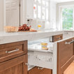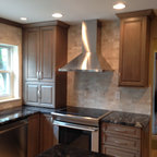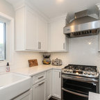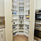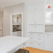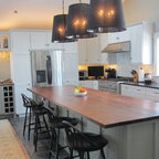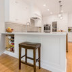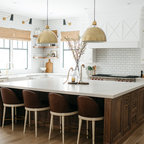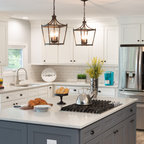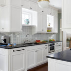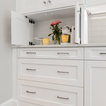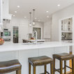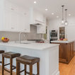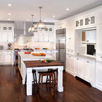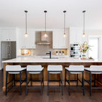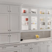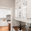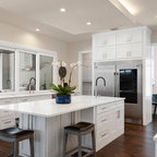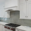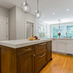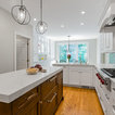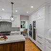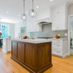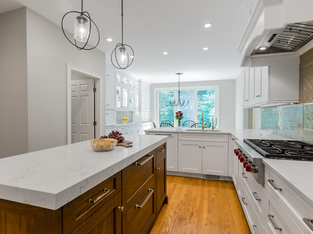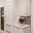 “Dramatic Transitional” in Dedham, MA features gorgeous details throughout. This timeless transitional design has tall ceilings with white painted Signature Custom Cabinetry stacked cabinets. The u-shape layout with island displays a china buffet, butler’s pantry and bar. The Alleanza Vagli quartz countertop from Rock Solid Tops LLC with a mitered edge sits atop a walnut countertop with a colonial stain finish. The glass subway tile backsplash details this space beautifully.