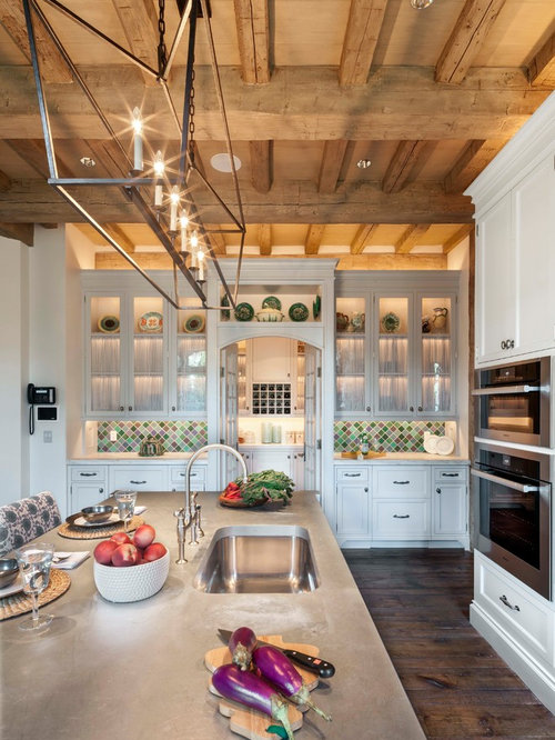 Beautiful Knotty Alder distressed and stained island top: Construction method-face grain; Special features-heavy distressing; Thickness-1.75"; Edge profile-softened; Stain-dark walnut stain; finish-Waterlox satin; Design by Valerie Helgeson of Design Directions; Project location-Okahoma City, OK; Photo by Valerie Helgeson