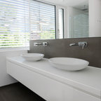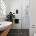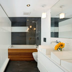 Good example of potential combination - dark floors, wooden vanity and large mirror with potentially no tiles on the wall behind the sink (backsplash).