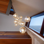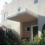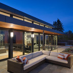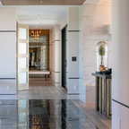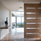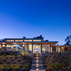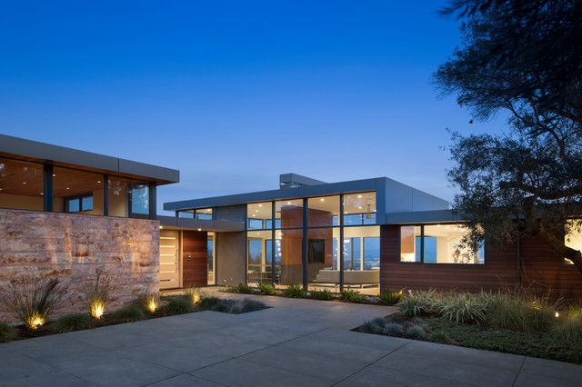 Walking up to the front door you travel through the parking court with landscaping design by Pederson Associates in San Rafael. At the far left is the new game room with Caldera split face stone wall and Fleetwood windows above. Around the other walls is smooth finish stucco and natural stained cedar siding. The paving is Connecticut Blue Stone.