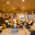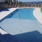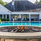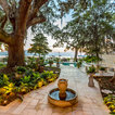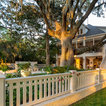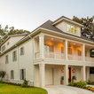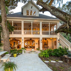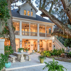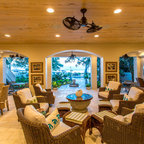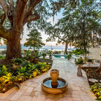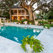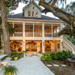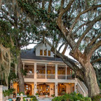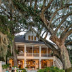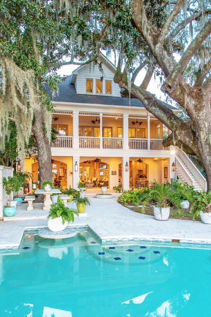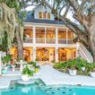 The home and pool area were actually designed around this hundreds-year-old live oak. The expansive balcony and porch was designed to take in views of the bay and overlook the resort style pool. The architectural detail is evident across the home's exterior with beautiful molding and arched doorways to the indoor outdoor living area. This bay front cottage was built by Bob Evans and designed by Bob Chatham Custom Home Design.