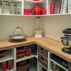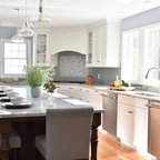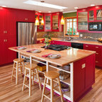Raked & painted shagrin base and upper cabinets. The main island was hand painted with a medium cherry wood top.