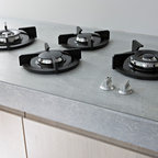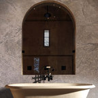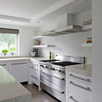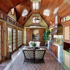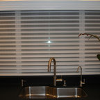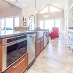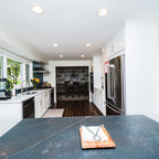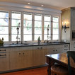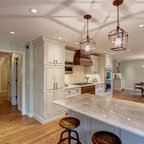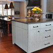 Secondary standing height island was raked & painted. All venetian bronze hardware is by Barz. All stone tops were a Compac quartz. Waterstone gantry faucets are done in weathered brass.