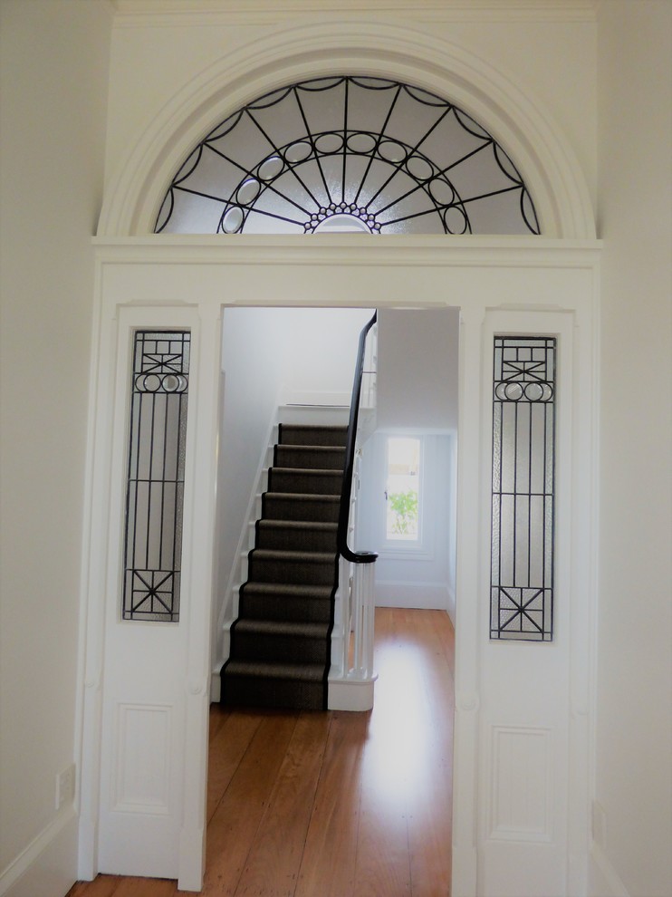 What an entrance, loving all of the glass work and those stairs. It just invites you in and frames the beauty of this historical house. The floors are so warm too.