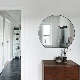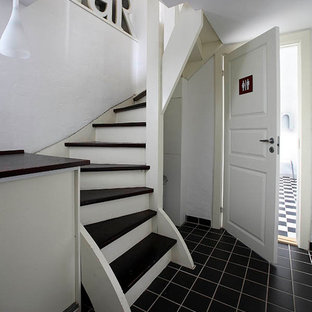 svarta golvplattor, vit vägg, vitt tak, bokstav, svarta trappsteg, trappa, svart trappa, vit dörr, vit taklampa, rutigt golv, toalettdörr, toalettskylt, trappförvaring, trätrappa,