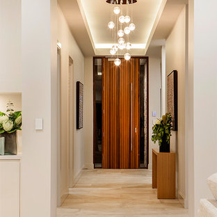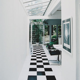 Hallway into the contemporary living/dining area added to the rear of the original terrace house. Sympathetic to the historic fabric, but with sleek, modern lines, in classical black and white with chrome details and greenery indoors and in the patio.
