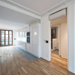 Le parti pris de ce projet est la création de lignes diagonales pour agrandir visuellement l’espace et briser l’effet couloir de l’entrée.