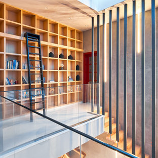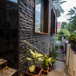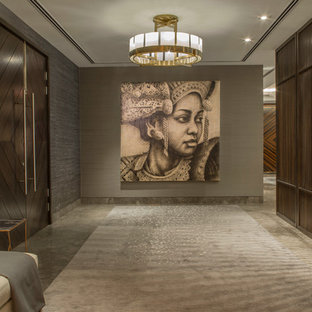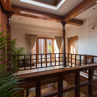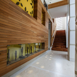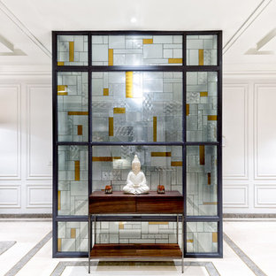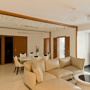 Once past the doorway, you step into a linear corridor that gives you a clear view of a puja room at the other end. The corridor ceiling is clad in wood with subtle cove lighting and forms the beginning of a common element that binds all common spaces in the home. A cement textured gallery wall on the left is adorned with black and white images of three generations of the family, giving guests their first intimate connect with members.