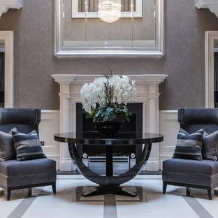 Welcoming you to our award-winning Whitelands project: the exquisite patterned flooring was designed by our interior architects to echo the regal architectural detailing in the rooms. Completed by this smoked eucalyptus veneer table by Eicholtz Pedestal and these dusky-lilac velvet chairs - alluring and soft to the touch.