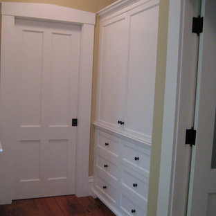When renovating this 19th century Greek Revival home, a master bath was added along an interior wall. Restored floor-to-ceiling windows in the adjacent hallway (which links the master bedroom with the children's rooms) allow light to carry into the bath via clerestory windows and frosted glass paneling on the bathroom door. We added period appropriate cabinetry for clothing and linens. Another new cabinet can be accessed from both the hallway and the bathroom, and is for storing towels and other bath needs. Original floor boards and mouldings were all fully restored as well. Doors at each end of the hallway mean that the space can also be used as a dressing area.