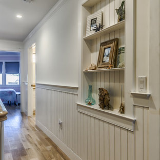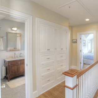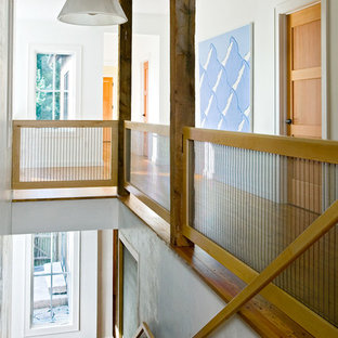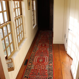 Being visible from the entryway below, these large, horizontal architectural prints add a touch of grandeur for the formal entryway. The convex Federal mirror reflects light from an oval, tracery window opposite, bringing a touch of sparkle to this faux-painted damask wall.