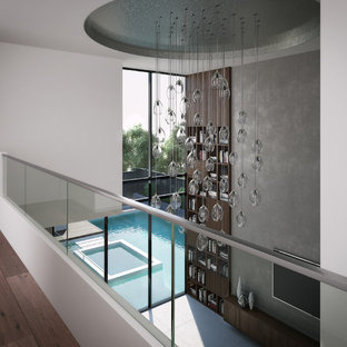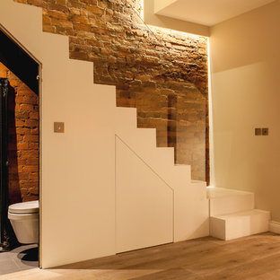 This bespoke staircase was designed by Timothy James Interiors to house a concealed cloakroom. The exposed brick walls contrast with the clean lines of the staircase and interior architecture of the hallway.