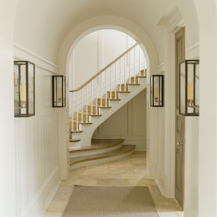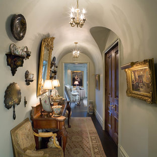 Mirrored tiles frame the entry, with a center anchored upholstered door that creates a secret entry to the room. Chinoiserie chest is an antique
