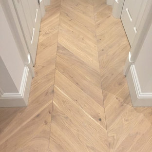 Oak natural - Engineered oak chevron parquet wood flooring in hallway and cupboards going to large open space living room. Stair treads and risers producers to fit costumers requirements.