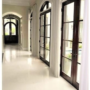 This is a long hallway that extends from the front door to the back door. Since it is part of the extensive family room the drapery was added to frame the french doors and add soften the hard surfaces.