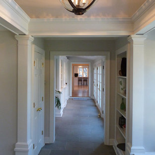 Designer, Joel Snayd. Beach house on Tybee Island in Savannah, GA. This two-story beach house was designed from the ground up by Rethink Design Studio -- architecture + interior design. The first floor living space is wide open allowing for large family gatherings. Old recycled beams were brought into the space to create interest and create natural divisions between the living, dining and kitchen. The crisp white butt joint paneling was offset using the cool gray slate tile below foot. The stairs and cabinets were painted a soft gray, roughly two shades lighter than the floor, and then topped off with a Carerra honed marble. Apple red stools, quirky art, and fun colored bowls add a bit of whimsy and fun.