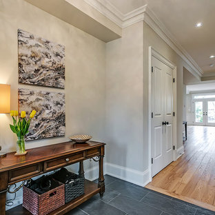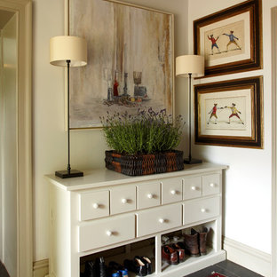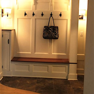 A small niche was carved out of the entry hallway to create a place for coats, hats and bench. As with other rooms in the unit, a colorful paint color was used to create a focal point and backdrop to the space.