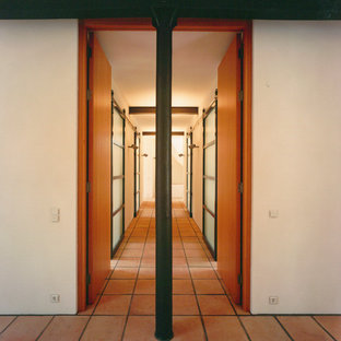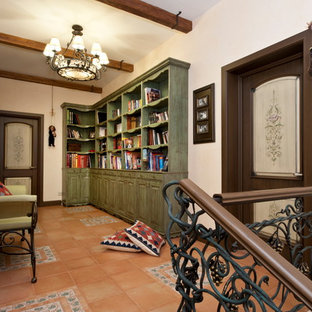 A custom designed hallway to a Spanish style home featuring Moorish style art niche, barrel ceilings, terra-cotta flooring.