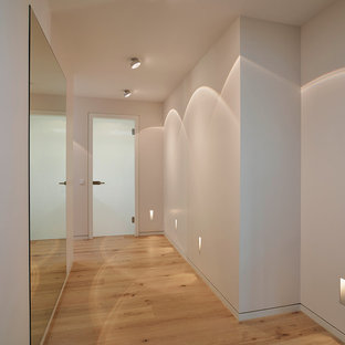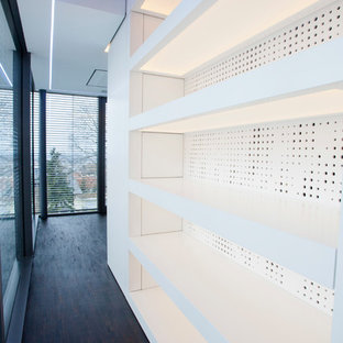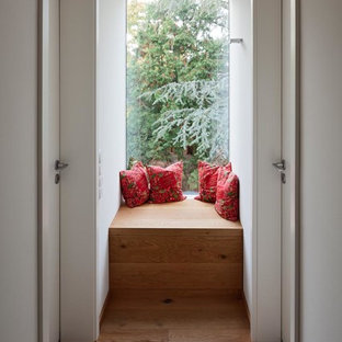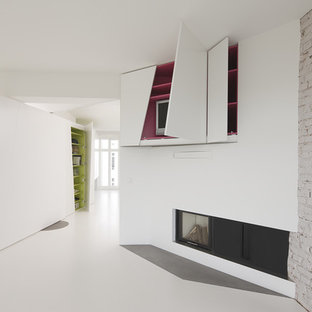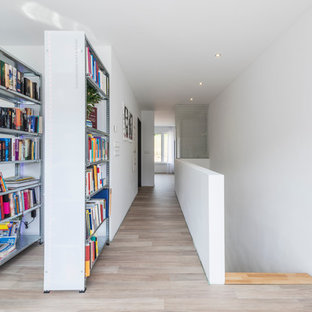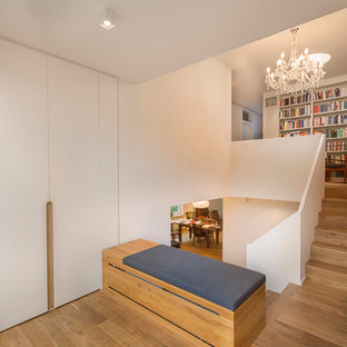 Freitragende Holztreppe mit betonbeschichteten Stufen. Der Absturzschutz ist hier kein klassisches Geländer, sondern ein Netz. links im Bild: Große Schiebetür als Raumteiler aus alten Eichebalken mit schmiedeeisernem Führungsbeschlag.