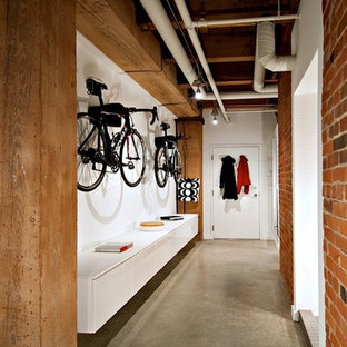 Open-plan industrial loft space in Gastown, Vancouver. The interior palette comprises of exposed brick, polished concrete floors and douglas fir beams. Vintage and contemporary furniture pieces, including the bespoke sofa piece, complement the raw shell.