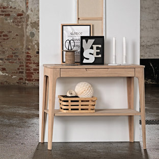 Oak wood hallway table perfect for entrance ways and displaying pictures, white candles and candle sticks, yarn and scissors, and a basket of ornaments in smaller spaces.