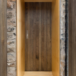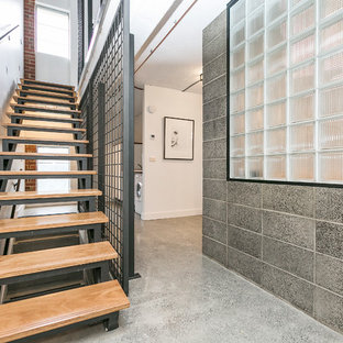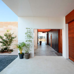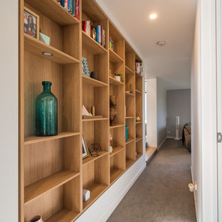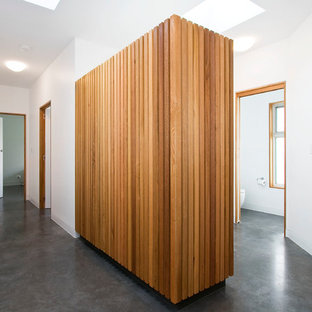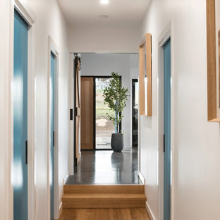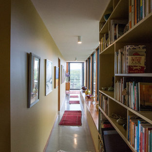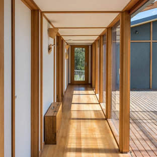 Hallway with plywood storage cupboards. Glass frames a view to one end.