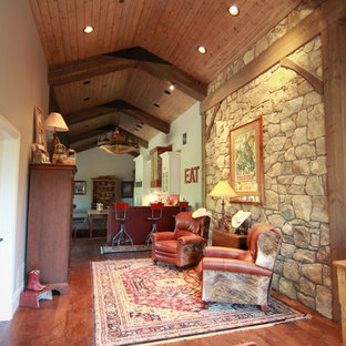 This home sits in the foothills of the Rocky Mountains in beautiful Jackson Wyoming. Natural elements like stone, wood and leather combined with a warm color palette give this barn apartment a rustic and inviting feel. The footprint of the barn is 36ft x 72ft leaving an expansive 2,592 square feet of living space in the apartment as well as the barn below. Custom touches were added by the client with the help of their builder and include a deck off the side of the apartment with a raised dormer roof, roll-up barn entry doors and various decorative details. These apartment models can accommodate nearly any floor plan design you like. Posts that are located every 12ft support the structure meaning that walls can be placed in any configuration and are non-load baring.
