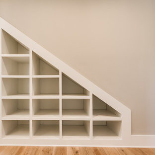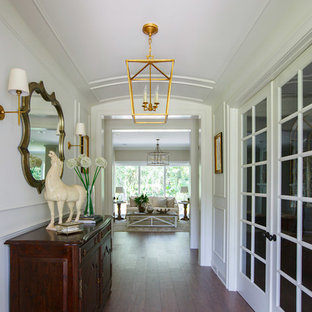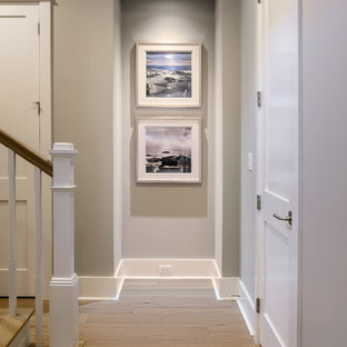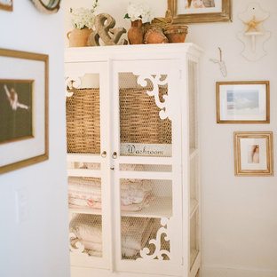 This hallway is filled with a white cottage armoire, framed photos & beach knick knacks.