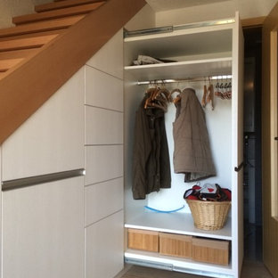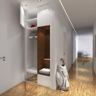 Da der Blick vom Wohnzimmer immer wieder zu der offenen Garderobe neben der Tür wanderte, haben wir dafür einen Raumteiler mit weißen Lamellen als „Sichtschutz“ entworfen. Die Hinterkante der Lamellenwand wurde dabei von der Lichtvoute der Decke vorgegeben.