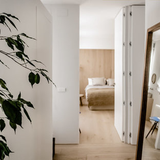 Hall y distribuidor que conecta la zona pública y privada de la vivienda. Espacio en blanco con alegres toques de color. Carpintería con cristal que permite el paso de luz por toda la casa.