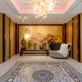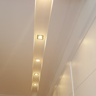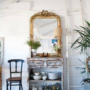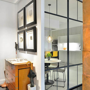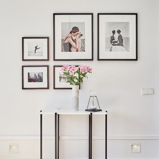 Hallways are a big bonus in a small space because of their potential for hooks for coats or hats, a photo gallery and, best of all, shelving. If you wanted to go higher than the timber shelving in this picture, you should choose white, otherwise the hallway will feel too skinny. - erika_commers