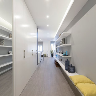 Los tonos grises son los elegidos para crear más claridad en el espacio central de la planta y al que le llega la luz natural de las habitaciones, pero no suficiente. Es por ello que el mobiliario elegido vuelve a ser el blanco para dar mayor aamplitud visual. Las paredes se llenan de recuerdos y elementos decorativos .