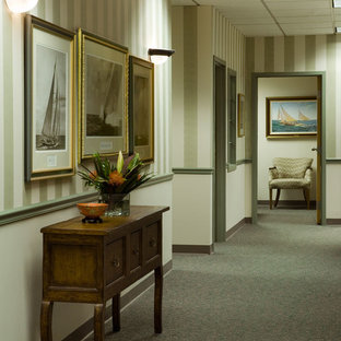 This hallway is complete with grey carpeted floors, a patterned arm chair, wooden table, striped painted walls, yellow door, grid windows, and sailing boat artwork.