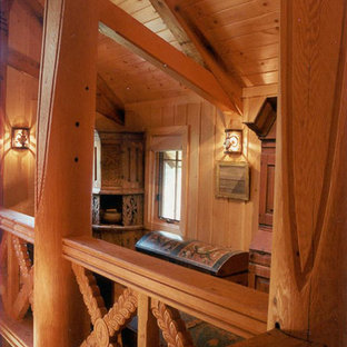 A rustic, timber frame house includes carved columns, rails and other details based on the Scandinavian ancestry of the client.
