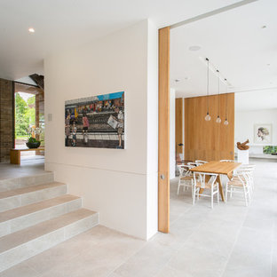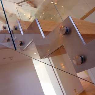 Continuous tread oak stair with frameless glazing with leather trim runner