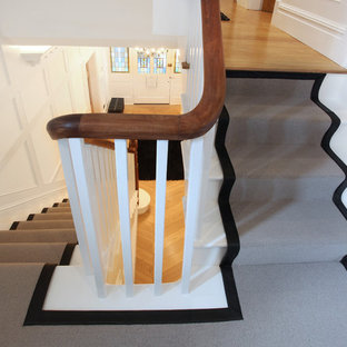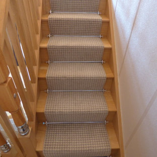 Our client had an existing solid oak staircase in their property. Whilst they loved the staircase, they wanted to make the feel softer without covering all of it completely. We worked with them and their interior designer to find the right carpet and Ulster Carpet's Boho Collection was decided upon - Chic, Moonshimmer - a houndstooth pattern. This was fitted as a runner, not only on the stairs but also on the landings too, in order to still allow the beauty of the solid oak to show. Care was taken to match the crystal stair rods and the carpet studs to the chrome features in the staircase. The edges of the carpet were hand bound on site.