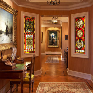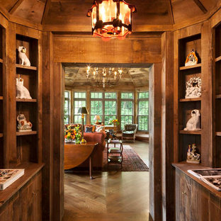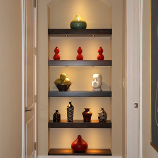 A completely paneled vestibule serves as a showcase for an important collection of porcelain figurines.