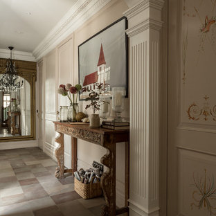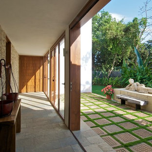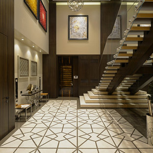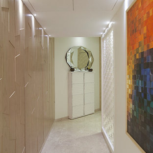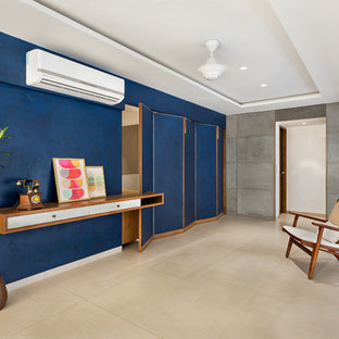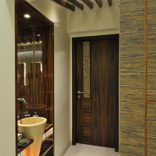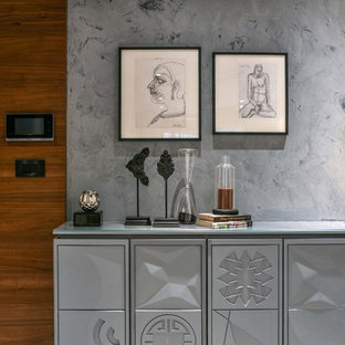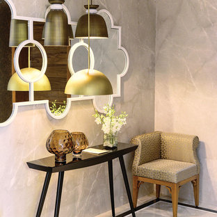 The passage leading to the bedrooms on the first level has been decorated with sleek console and leaf-shaped artefacts on the wall.