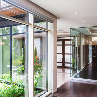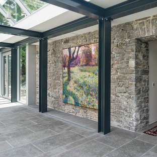 This addition replaced a 2-car garage and pool house with a lavish spa, guest house and 4-car garage, accompanied by a new landscaped terrace with pool, hot tub and outdoor dining area. A covered walk-way was replaced with a fully enclosed glass link that provides year-round access between the addition and main house, and provides a secondary entrance to the home.