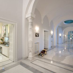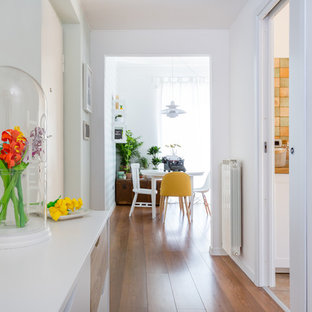 Nell'ingresso è stato eliminato un arco ormai fuori moda, sostituito lo spatolato che incupiva lo spazio e tinteggiato di bianco le pareti per dare luminosità, sul mobile in primo piano, una campana di vetro conserva fiori di carta (glicini) colorati in stile (diy)