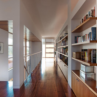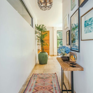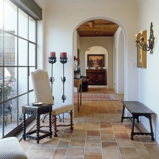 Hallway to master bedroom. Note the wood floor with inset stone tile border. The ceiling was arched to match the entry arch and give height to the small space making it a special passage to the master bedroom.