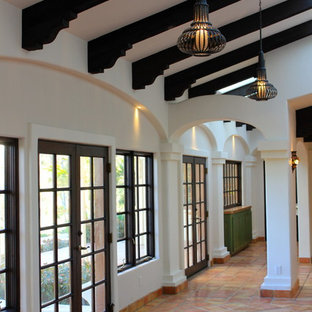 Sunroom/Hallway: pendent lighting, tile, dark stained trim, windows, beams, arches, columns